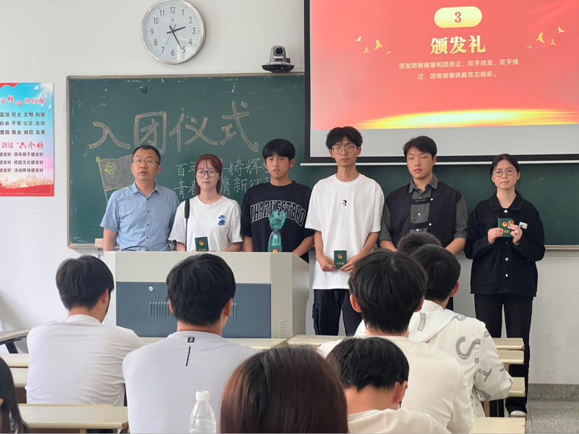 云顶国际乐场 党总支副书记、副院长卢玉军为新入团的成员颁发团徽和团员证