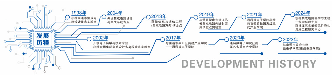 南通大学集成电路相关专业的发展可溯源至上世纪90年代,是国内较早开展集成电路教学科研的高等院校之一。1998年成立了南通市集成电路设计重点实验室;2002年,经教育部批准开设电子科学与技术专业,同年获批专用集成电路设计省高校重点实验室;2004年开设集成电路设计与集成系统专业;2013年,获批信息与通信工程一级学科博士点,下设通信与信息系统集成电路二级学科博士点;2017年与南通市崇川区合作共建产业云顶国际乐场 ——通科微电子云顶国际乐场 ;2019年与通富微电共建江苏省集成电路先进封装测试重点实验室;2020年通科微电子云顶国际乐场 获批江苏省重点产业云顶国际乐场 ;2021年获批教育部首批现代产业云顶国际乐场 ;2024年重组获批半导体器件与集成电路设计封测省高校重点实验室,申报获批集成电路科学与工程一级学科硕士点、江苏省射频芯片异构集成工程研究中心。